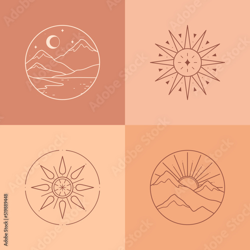 Wall mural set of vector linear boho emblems.bohemian logos with lake,sun and sunburst,snowcapped mountains and - Wall murals Wall mural set of vector linear boho emblems.bohemian logos with lake,sun and sunburst,snowcapped mountains and - Wall murals