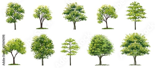 Wall mural set of watercolor of tree side view isolated on white background for landscape and architecture draw