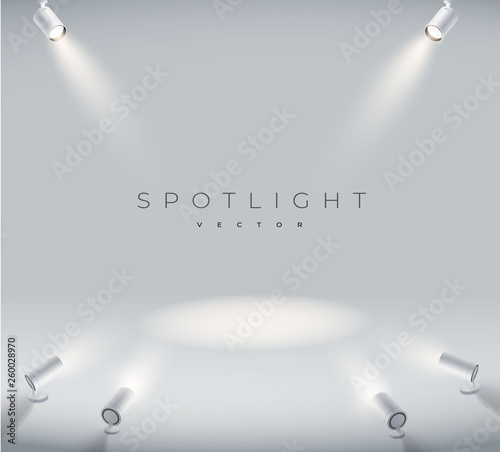 The watermark will not be included on Wall mural.: Set spotlights realistic with bright white light shining stage vector set - illuminated effect form p