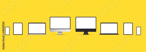 Wall mural : Set technology devices with empty display - realistic set of monitor, laptop, tablet, smartphone - bla