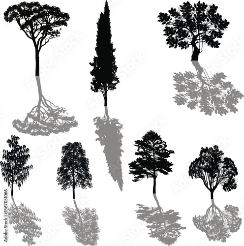 Wall mural seven trees with shadows isolated on white - Wall murals Wall mural seven trees with shadows isolated on white - Wall murals