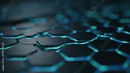 Wall mural : Shallow depth of field close-up shot of a softly glowing futuristic hexagonal grid pattern, with a s