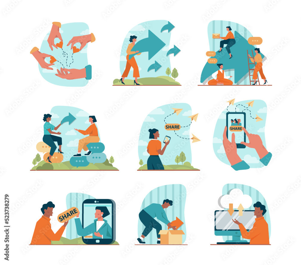 Wall mural sharing concept set. character using devices to share posts in social - Wall murals Wall mural sharing concept set. character using devices to share posts in social - Wall murals