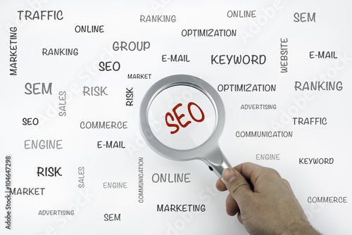 Wall mural sheet with text and magnifier enlarging word seo - Wall murals Wall mural sheet with text and magnifier enlarging word seo - Wall murals