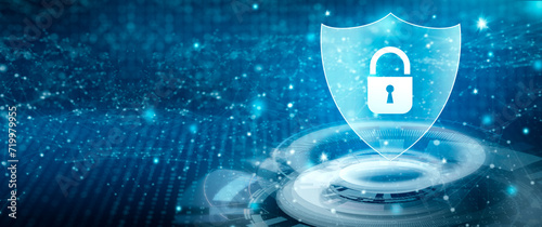 Wall mural shield with padlock icon in personal data security cyber data and information privacy with blue back - Wall murals Wall mural shield with padlock icon in personal data security cyber data and information privacy with blue back - Wall murals