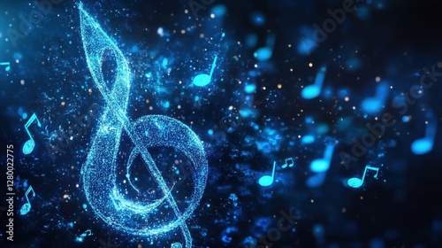 Wall mural : Shimmering treble clef with floating musical notes and sparkles