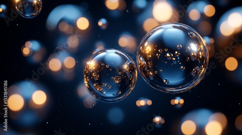 Shiny spheres float in a dark space with blurred background lightsWall mural