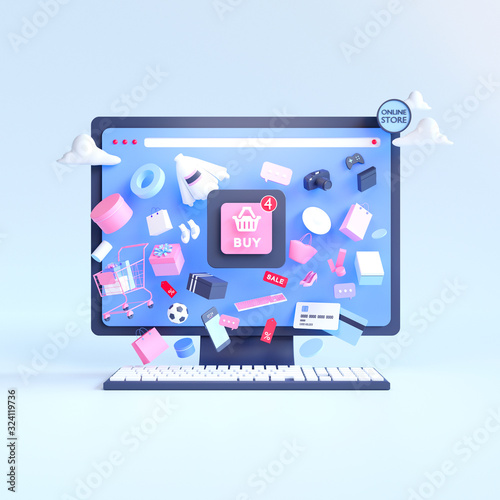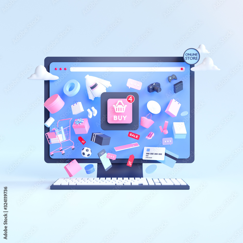 Wall mural shopping on-line. online store on website or mobile application. 3d rendering background. digital ma