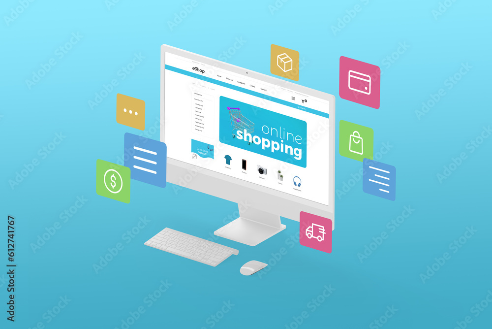 The watermark will not be included on Wall mural.: Shopping online illustration with computer display in isometric position and ecommerce web page with