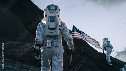 The watermark will not be included on Wall mural.: Shot of the two astronauts exploring mars/ red planet - one cosmonaut carries american flag - technolo
