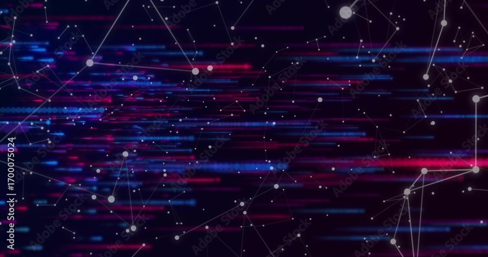 Wall mural showing digital network connecting nodes flowing across cyberspace, with neon streaks and particles