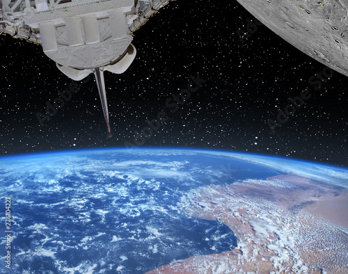 Wall mural : Shuttle, earth and planet with craters like moon - the elements of this image furnished by nasa -