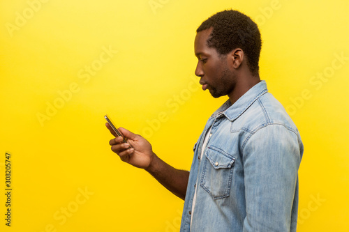 The watermark will not be included on Wall mural.: Side view of serious man in denim shirt using cellphone, typing text message or dialing number with