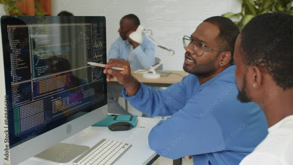The watermark will not be included on Wall mural.: Side view of two bi-ethnic programmers sitting in front of monitor and fixing bags in script while c
