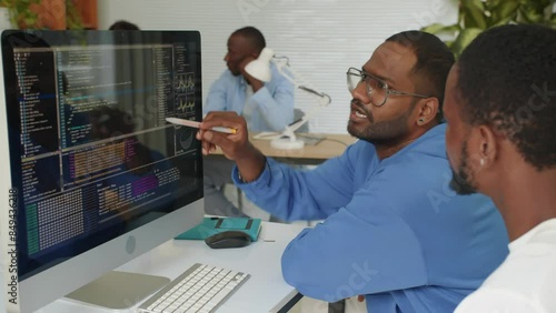 Wall mural : Side view of two bi-ethnic programmers sitting in front of monitor and fixing bags in script while c