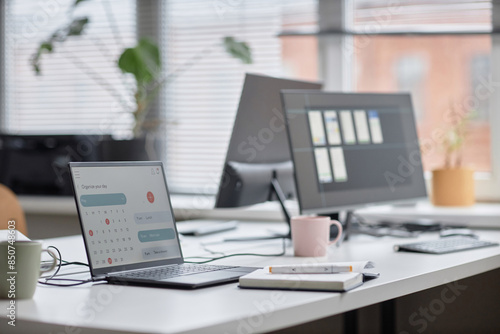 Side view shot in pastel colors of office workplace table with laptop displaying calendar page, noteWall mural
