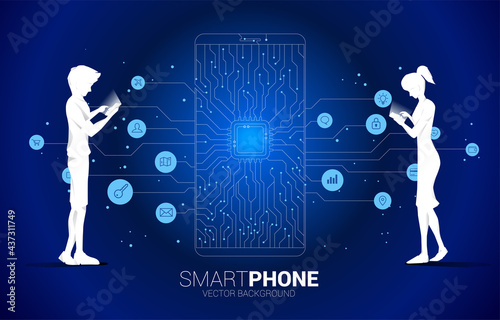 Wall mural : Silhouette man and woman use mobile phone and cpu dot connect line circuit board style mobile phone