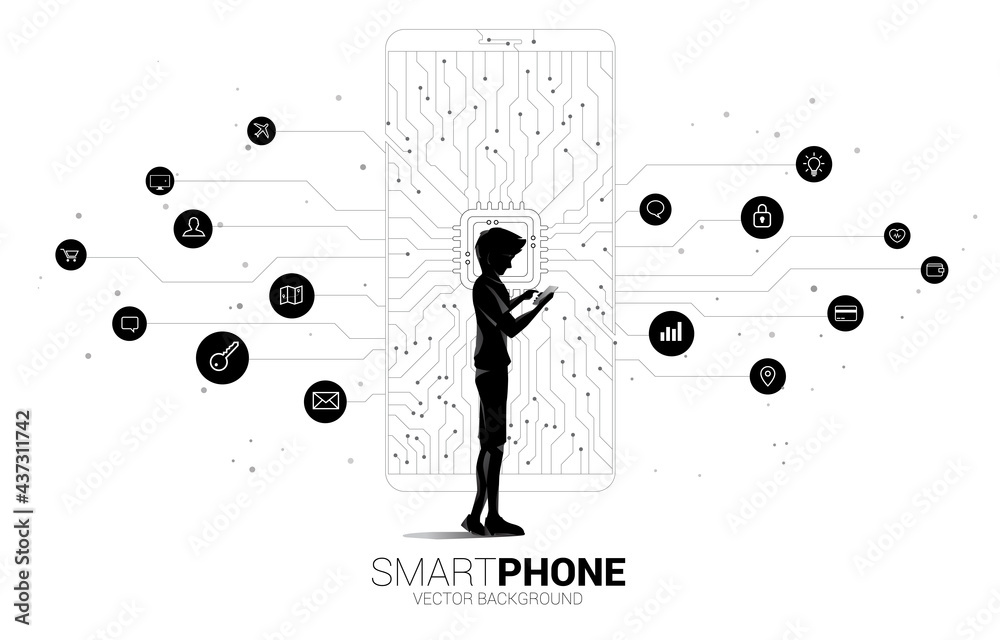 Wall mural silhouette man and woman use mobile phone and cpu dot connect line circuit board style mobile phone  - Wall murals Wall mural silhouette man and woman use mobile phone and cpu dot connect line circuit board style mobile phone - Wall murals