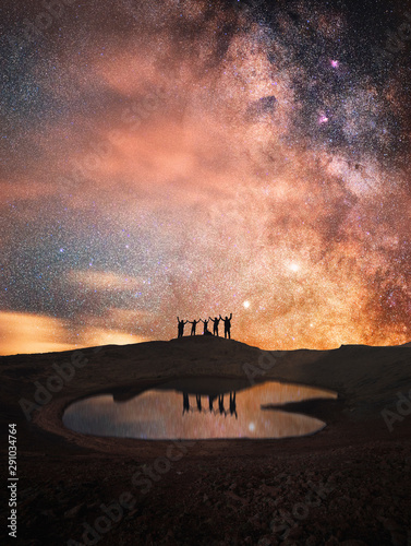 Wall mural silhouette of a group of people standing on a mountain. behind their beautiful starry sky and the mi