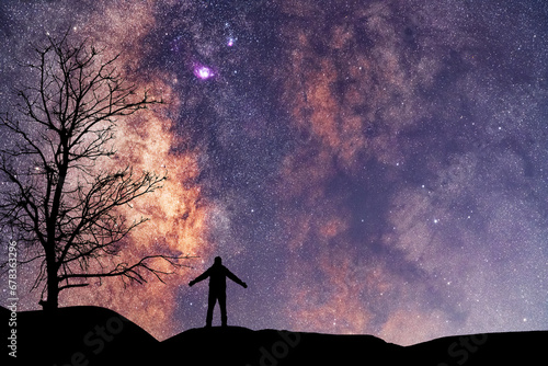 Wall mural silhouette of a hiker standing on the hill, on the milky way galaxy background. cosmos wallpaper.