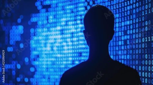 The watermark will not be included on Wall mural.: Silhouette of a person against a blue binary code background