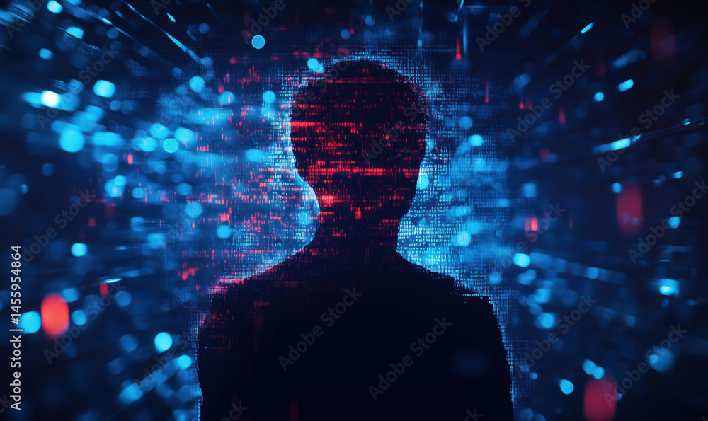 Wall mural : Silhouette of a person against a digital background with glowing data streams -