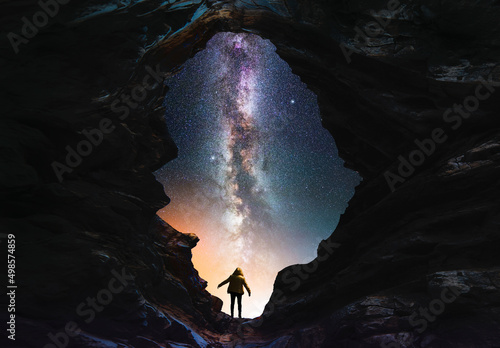 Wall mural silhouette of a person in the cave looks on the bright milky way galaxy. fantasy scene.