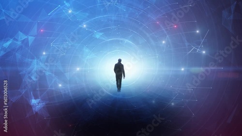 Silhouette of a walking man on artificial intelligence cyberspace motion background - Wall mural