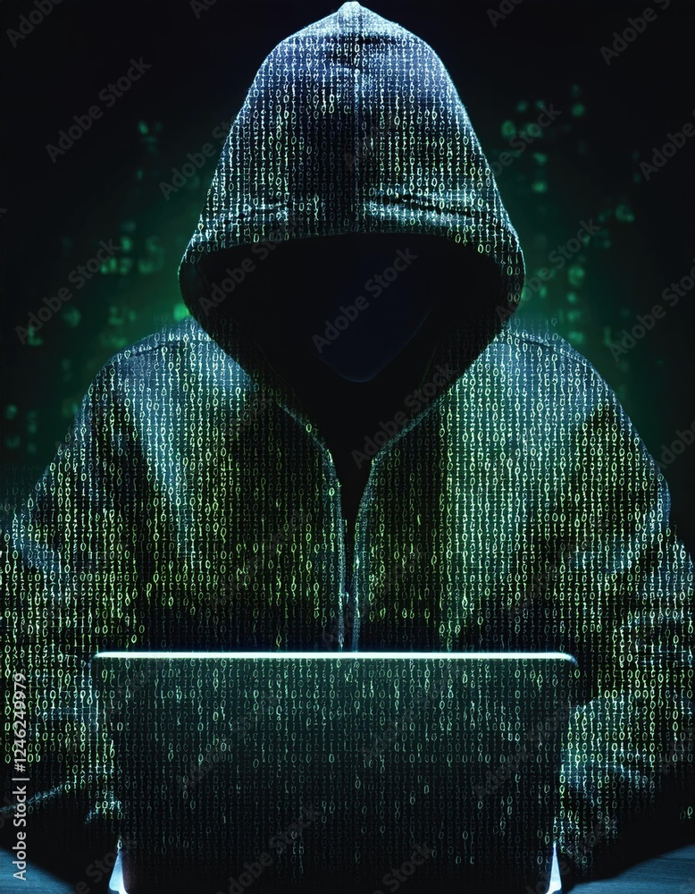 The watermark will not be included on Wall mural.: Silhouette of hooded hacker made of binary code