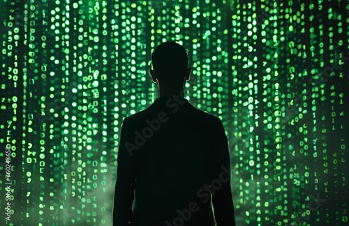 The watermark will not be included on Wall mural.: Silhouette of man in front of green matrix code background