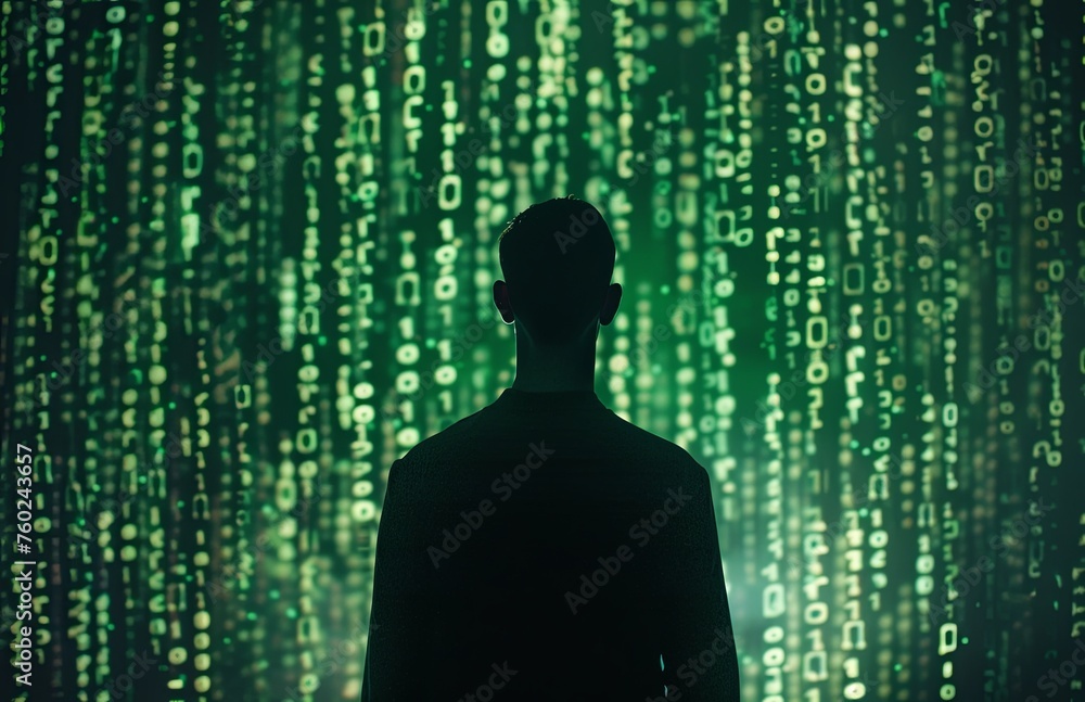 Wall mural silhouette of man in front of green matrix code background - Wall murals Wall mural silhouette of man in front of green matrix code background - Wall murals