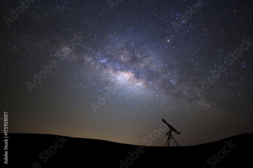 Wall mural silhouette of telescope watching the wilky way galaxy with stars and space dust in the universe