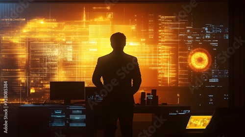 Wall mural : Silhouetted figure analyzing futuristic digital data and finance information on glowing interface sc