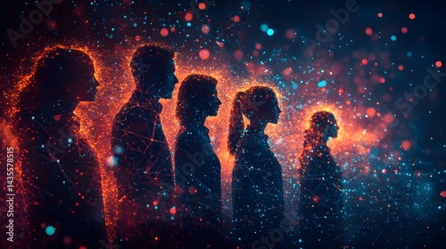 The watermark will not be included on Wall mural.: Silhouetted figures rendered as interconnected digital networks transition through warm and cool col