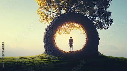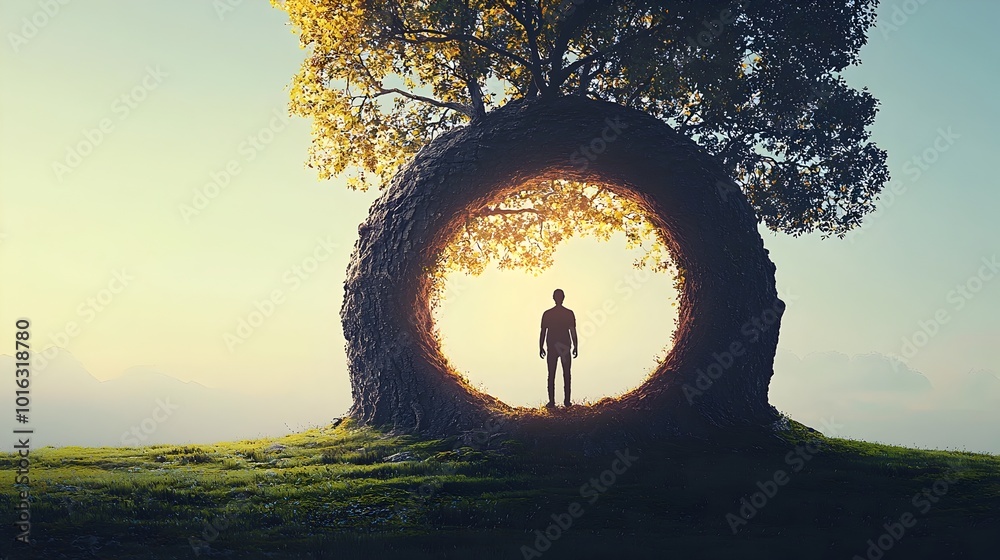 The watermark will not be included on Wall mural.: Silhouetted human figure embedded within the trunk of a massive ancient tree a symbolically rich sce