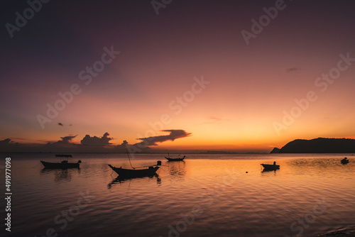 Silhouettes of fishing boats on the sea at a beautiful sunsetWall mural