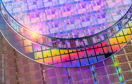 Wall mural silicon wafers with microchips used in electronics for the fabrication of integrated circuits - Wall murals Wall mural silicon wafers with microchips used in electronics for the fabrication of integrated circuits - Wall murals
