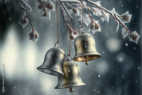 Wall mural : Silver bells hanging on bare tree branch with winter nature in background, created with generative a