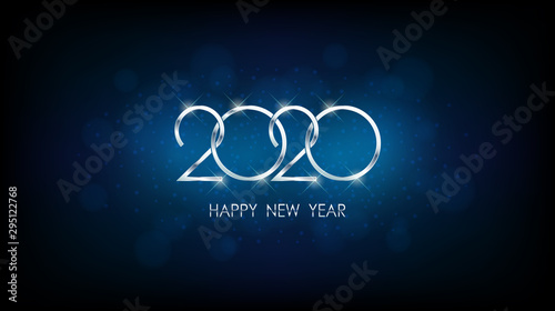 Wall mural silver happy new year 2020 with abstract bokeh and lens flare pattern in vintage blue color backgrou