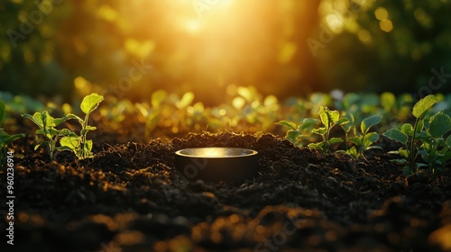Wall mural : Simple ai-powered soil sensor in the ground, minimal scene with soft light, large copy space around,