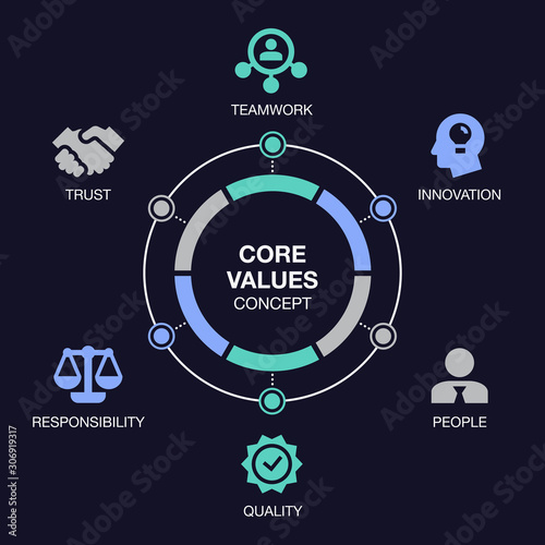 The watermark will not be included on Wall mural.: Simple infographic for core values visualization with colorful pie chart and icons, isolated on dark
