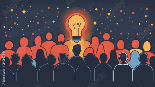 Wall mural : Simple line art logo design on gray background featuring light bulb with abstract figures in audienc