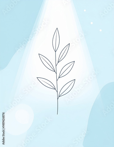 Wall mural simple linear herb sprig reaches toward light in minimal abstract design, set against soft blue back