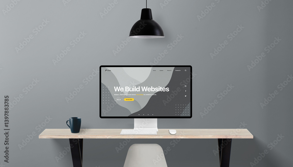 The watermark will not be included on Wall mural.: Simple work desk with computer display showing concept website for a web design studio, ‘we build we