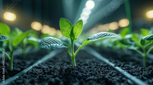 Wall mural : Single ai-driven sensor monitoring plant growth, minimalistic scene with soft light and ample copy s