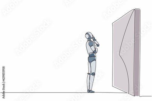 Wall mural single continuous line drawing robot thinking in front of big obstacle or wall. modern robotic artif