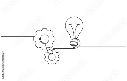 The watermark will not be included on Wall mural.: Single continuous line symbol of machine wheel gears and light bulb vector illustration, continuous