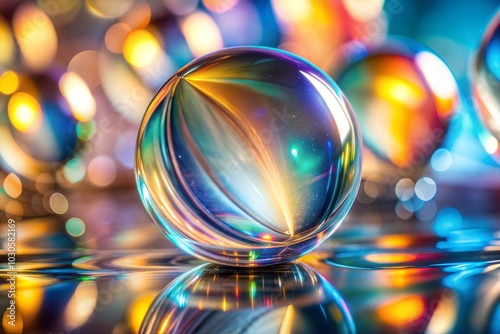 The watermark will not be included on Wall mural.: Single glass sphere on reflective surface with bokeh lights