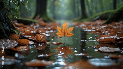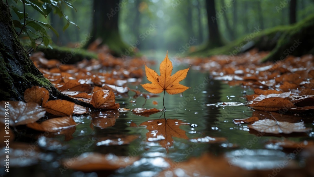 The watermark will not be included on Wall mural.: Single maple leaf floating in still water surrounded by autumn foliage in a serene forest setting wi