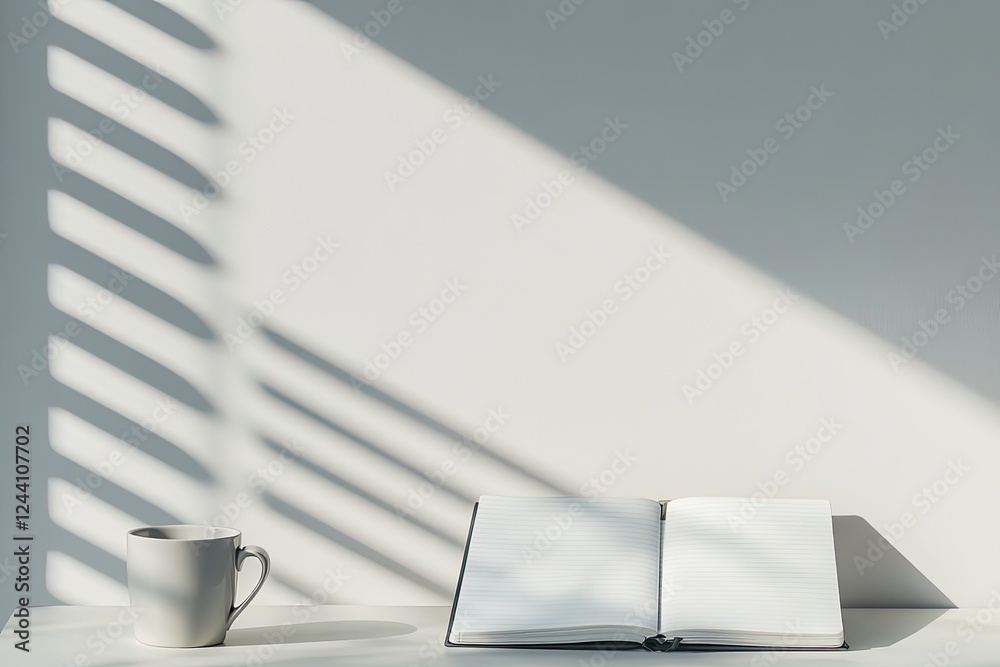 The watermark will not be included on Wall mural.: Single open notebook with clean unlined pages placed on modern desk soft natural light filtering in